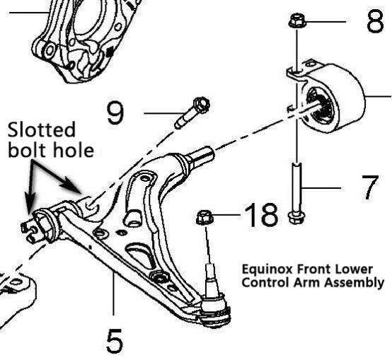 Gambar ing ndhuwur nuduhake perakitan lengen kontrol ngisor ngarep kanggo Chevrolet Equinox. Panah nuduhake struktur bolongan mbukak-bolt ing rakitan bushing.