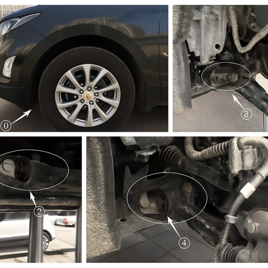 Foto-foto sadurunge nggambarake kondisi struktural gagal busing lengen kontrol suspensi ngarep ing Chevrolet Equinox. Iki menehi saran marang pangguna yen, kaya sing dituduhake ing diagram ing ndhuwur, komponen struktural kanthi potensial gagal bisa dipriksa kanthi ngowahi setir menyang kunci lengkap ing posisi ①. Verifikasi safety saka perakitan bushing kudu ditindakake liwat foto sing dijupuk ing pirang-pirang lokasi kalebu posisi ②, , lan ④.