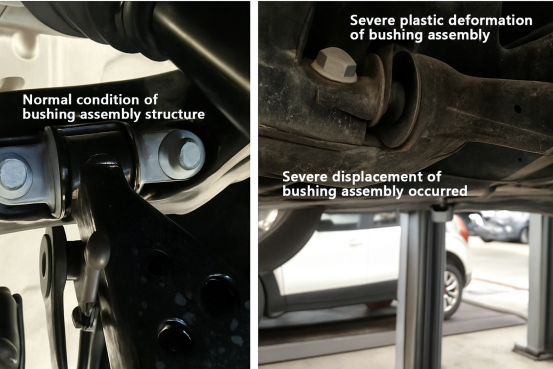 Perbandhingan digawe antarane rakitan bushing lengen kontrol sing normal (kaya sing ditampilake ing gambar sisih kiwa ngisor) lan rakitan bushing sing rusak (kaya sing ditampilake ing gambar sisih tengen ngisor). Dheweke nuduhake yen kanthi mbandhingake gambar kiwa lan tengen ing ngisor iki, gampang dimangerteni manawa celah ing busing lengen kontrol normal ing sisih kiwa seragam, lan ora ana bending utawa deformasi sing jelas kaya sing ditampilake ing gambar tengen. Yen kendharaan nuduhake kahanan sing ditampilake ing gambar sing bener, kendaraan kasebut wis mbebayani nalika digunakake.