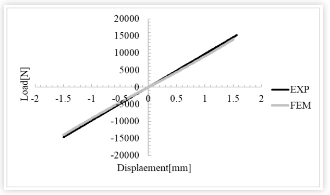 Kurva kaku bushing (kurva pamindahan pasukan) dibandhingake karo asil eksperimen, luwih mbuktekake validitas model FEM sing diadegake. Minangka bisa dideleng saka gambar: analisis nggunakake paramèter hyperelastic sing diidentifikasi saka spesimen uji materi nuduhake konsistensi apik antarane asil eksperimen lan analitis ing diagram pamindahan beban.