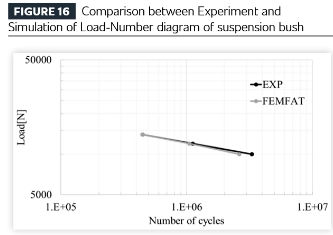 Sabanjure, asil analisis struktural ing ndhuwur ditransfer menyang modul analisis kelelahan piranti lunak (ing kasus iki nggunakake piranti lunak FEMFAT saka Magna ECS) lan dibandhingake karo asil tes daya tahan. Tes lan analisis nduduhake konsistensi sing apik banget ing urip kesel lan lokasi retak.