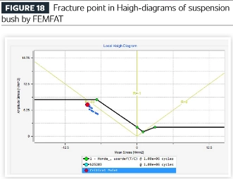 Diagram Haigh saka asil simulasi kelelahan kanggo bushing suspensi nuduhake fraktur ing rasio stres tekan. Sanajan beban tensile lan compressive ditrapake kanthi padha ing bahan karet, analisa kasebut nuduhake yen kegagalan pungkasane diwiwiti kanthi kompresi.